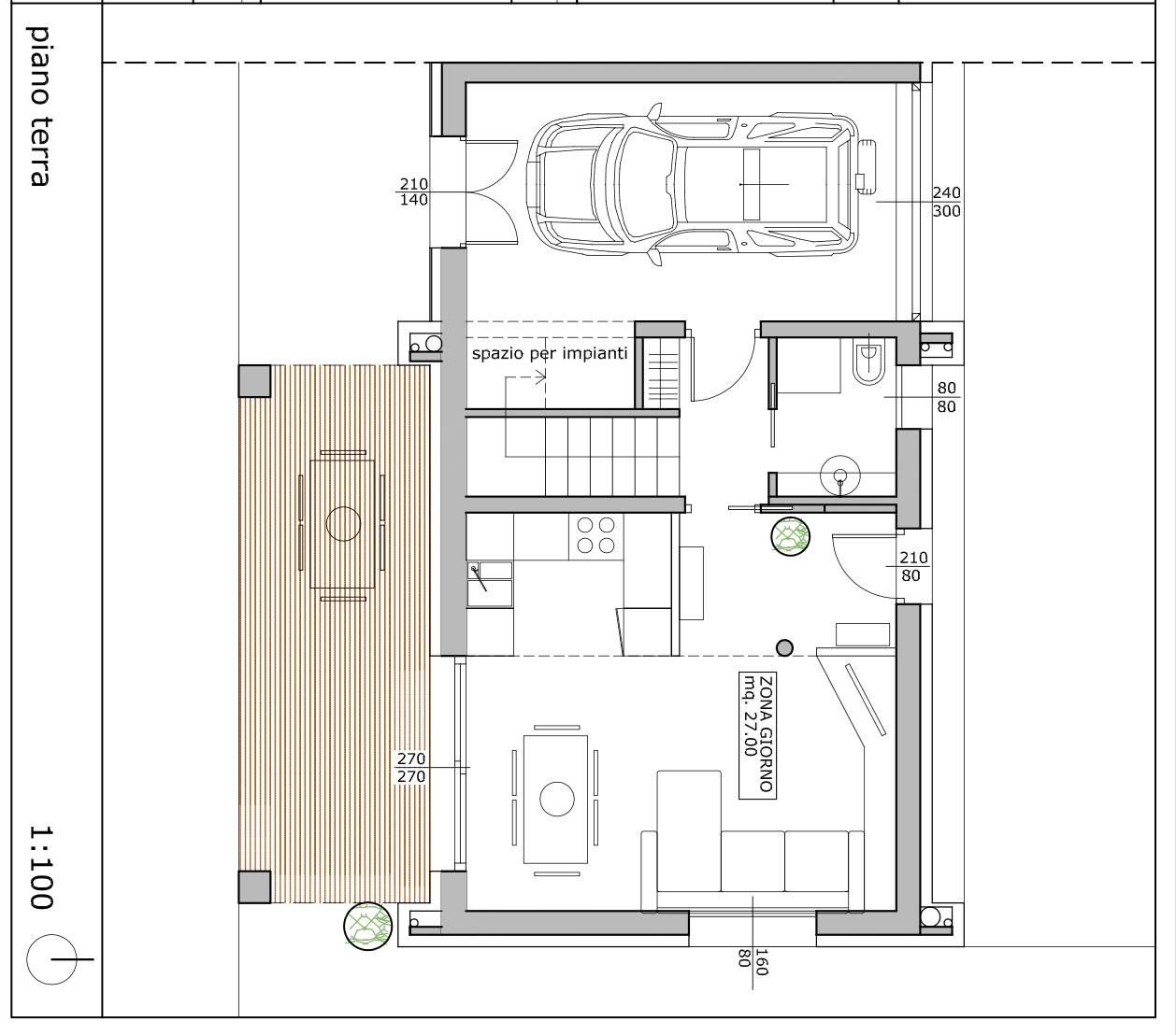 L'abitazione è composta al piano terra da una zona giorno di circa 30 mq con cucina e soggiorno open space, un bagno finestrato e un garage di 17 mq collegato internamente.
